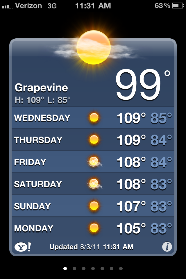 I mean, do you SEE that? It’s 99 and it’s not even noon. And do you see what the rest of the week is supposed to be like? Seriously. My face may melt.